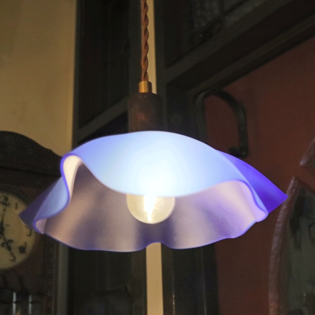 mishikaオリジナルのペンダントライト。 フリルのすりガラスがやさしい光を届けます。 一点もの。 【【サイズ】高さ約8cm×幅約20cm 重さ 約0.4kg 【電球】口金E17。LED電球1個付き、白熱球も40Wまで使用可。 【電源】引掛けシーリング (シーリングカバー付き) 【コード】長さ約50cm。茶色。 窯で曲げたガラスを砂を吹き付けて(サンドブラスト)すりガラスに加工しています。 優しいフリル模様。 □■ ご注意 ■□ ・LEDランプは交換可能ですので、長くご使用いただけます。 ・お使いの端末によって色味が異なって見える場合がありますので、予めご了承ください。 ・質問や不明点がありましたら、いつでもお気軽にお尋ねください。 ・ご質問等ございましたら、お気軽にメールでお問い合わせ下さい。