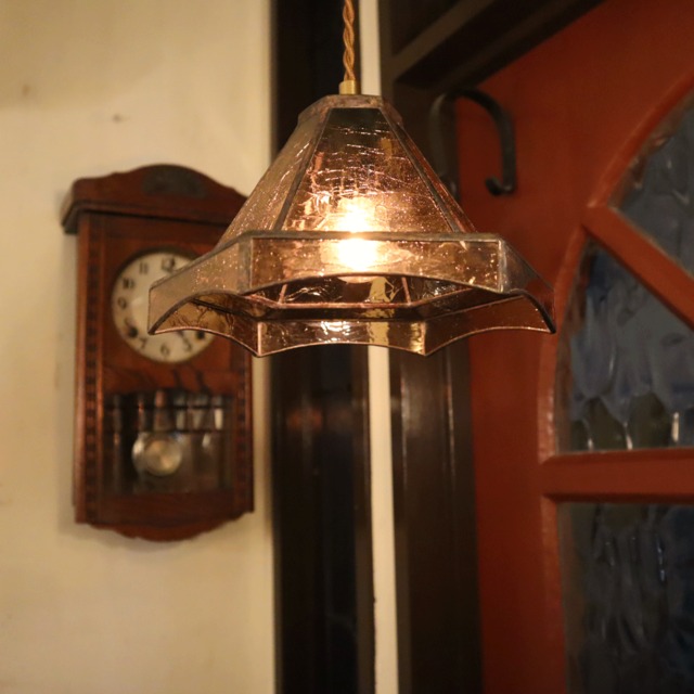 mishikaオリジナルのペンダントライト。 手吹きのアンティークガラスがやさしい光を届けます。 一点もの。 【サイズ】高さ約12cm×直径約20cm(ランプ部分) 重さ 約0.6kg 【電球】口金E17。LED電球1個付き、白熱球も40Wまで使用可。 【電源】引掛けシーリング (シーリングカバー付き) 【コード】長さ約50cm。茶色。 ヨーロッパのアンティークガラス(手吹きガラス)を使用しております。 とても高価なガラスなので、在庫のガラス限りです。 手吹きならではの雰囲気のあるガラスです。 □■ ご注意 ■□ ・ランプ一つのお値段です。 ・在庫のない場合は製作日数を頂きます。お気軽に在庫・納期をお問い合わせ下さい。 ・手作りならではの風合いや個体差がございます。アンティークガラスも手吹きのガラスの為、少しずつ風合いが違います。あらかじめご了承ください。 ・LEDランプは交換可能ですので、長くご使用いただけます。 ・お使いの端末によって色味が異なって見える場合がありますので、予めご了承ください。 ・質問や不明点がありましたら、いつでもお気軽にお尋ねください。 ・ご質問等ございましたら、お気軽にメールでお問い合わせ下さい。