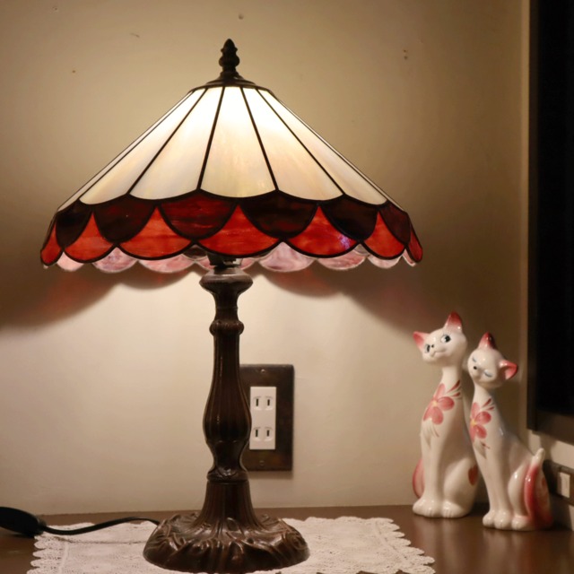 mishikaオリジナルのランプスタンドです。 イギリスの古い邸宅にありそうな、ステンドグラスのランプ。 シンプルだけど重厚感もあり、くすんだ色味のアンティーク感、温かな色味。 リビングや寝室、書斎に置くだけで、おしゃれで落ち着く空間になります。 忙しい日常を忘れて紅茶を飲みながら読書のひととき。。 【サイズ】高さ約49cm×幅約35cm 重さ 約2.5kg 【電球】口金E17。LED電球1個付き、白熱球も40Wまで使用可。 【電源】コンセント 【コード】長さ約50cm。黒色。 □■ お手入れ方法 ■□ ・柔らかい布で優しく拭いてください。 ・水拭きも可。 □■ ご注意 ■□ ※※店頭でも販売させて頂いておりますので、販売済みでも反映が間に合わない場合がございます。一点ものの場合、お売りできない場合がございます。大変恐れ入りますがご了承下さい。 ・ひとつひとつ手作りのため、多少の歪みや色合いの違いがございますが、一点ものの魅力としてお楽しみください。 ・破損を防ぐため、過度な力を加えないようご注意ください。 ・LEDランプは交換可能ですので、長くご使用いただけます。 ・お使いの端末によって色味が異なって見える場合がありますので、予めご了承ください。 ・質問や不明点がありましたら、いつでもお気軽にお尋ねください。 ・ご質問等ございましたら、お気軽にメールでお問い合わせ下さい。 ・発送の際の梱包資材はリサイクル品を使用させて頂いております。その分極力送料を抑えておりますので、ご了承くださいませ。