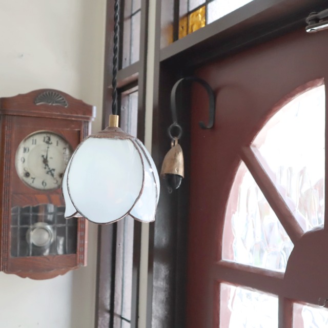 mishikaオリジナルのすずらんペンダントライト。 優雅なすずらんのデザインが、やさしい光を届けます。 いくつか並べて灯すのもおすすめです。 【サイズ】高さ約12cm×幅約12.5cm 重さ 約450g 【電球】口金E12。LED電球1個付き、白熱球も40Wまで使用可。 【電源】引掛けシーリング 【コード】長さ約50cm。黒色。 ヨーロッパのアンティークガラス(手吹きガラス)を使用しております。 とても高価なガラスなので、在庫のガラス限りです。 ほのかな流れのある半透明の雰囲気のあるガラスです。 □■ ご注意 ■□ ・ランプ一つのお値段です。 ・在庫のない場合は製作日数を頂きます。お気軽に在庫・納期をお問い合わせ下さい。 ・手作りならではの風合いや個体差がございます。アンティークガラスも手吹きのガラスの為、少しずつ風合いが違います。あらかじめご了承ください。 ・LEDランプは交換可能ですので、長くご使用いただけます。 ・お使いの端末によって色味が異なって見える場合がありますので、予めご了承ください。 ・質問や不明点がありましたら、いつでもお気軽にお尋ねください。 ・ご質問等ございましたら、お気軽にメールでお問い合わせ下さい。