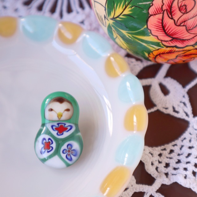 フクロウのマトリョーシカできました。 mishikaオリジナルのベネチアングラスのマトリョーシカシリーズです。 華やかで独特なデザインで日常のコーディネートを彩ります。 【サイズ】体長 約31mm 【素材】ベネチアングラス、ピンは真鍮 【商品の特徴】 ベネチアングラスを溶かして作り上げたフクリョーシカ。 見る角度によって様々な表情を楽しめます。 伝統的なマトリョーシカの形を活かしつつ、ガラス特有の透明感と色合いが魅力です。 エマイユ絵付けの後、一晩窯入れを何回か繰り返し、完成まで一週間かかっているとは思えないゆる~いキャラに仕上がりました。 普段使いはもちろん、特別な日のアクセントにも。。 一点もののブローチであなただけの個性的なスタイルを楽しんでください! 友人や大切な方へのプレゼントとしても喜ばれるアイテムです^^ □■蝶タックピンについて■□ つまみをつまんでキャッチを引き抜いて下さい。 装着するときは、つまみをつままずに針にキャッチをカチッとするまで差し込んで下さい。 □■ オプション選択できます■□ ・ギフトラッピング無料です。 □■ お手入れ方法 ■□ ・水洗い後は柔らかい布で優しく拭いてください。 □■ ご注意 ■□ ・ひとつひとつ手で作っており、絵付け、窯入れしているため、歪み・にじみ・裏の焼き跡が付く場合がございます。何卒ご了承下さい。 ・破損を防ぐため、過度な力を加えないようご注意ください。 ・お使いの端末により色味が多少異なって見えることがございますので、予めご了承ください。 ・気になる点がございましたら、ご注文前にお気軽にご質問ください。 商品番号:25