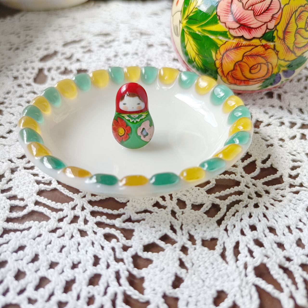 伝統的なマトリョーシカの形を活かしつつ、ガラス特有の透明感と色合いが魅力です。