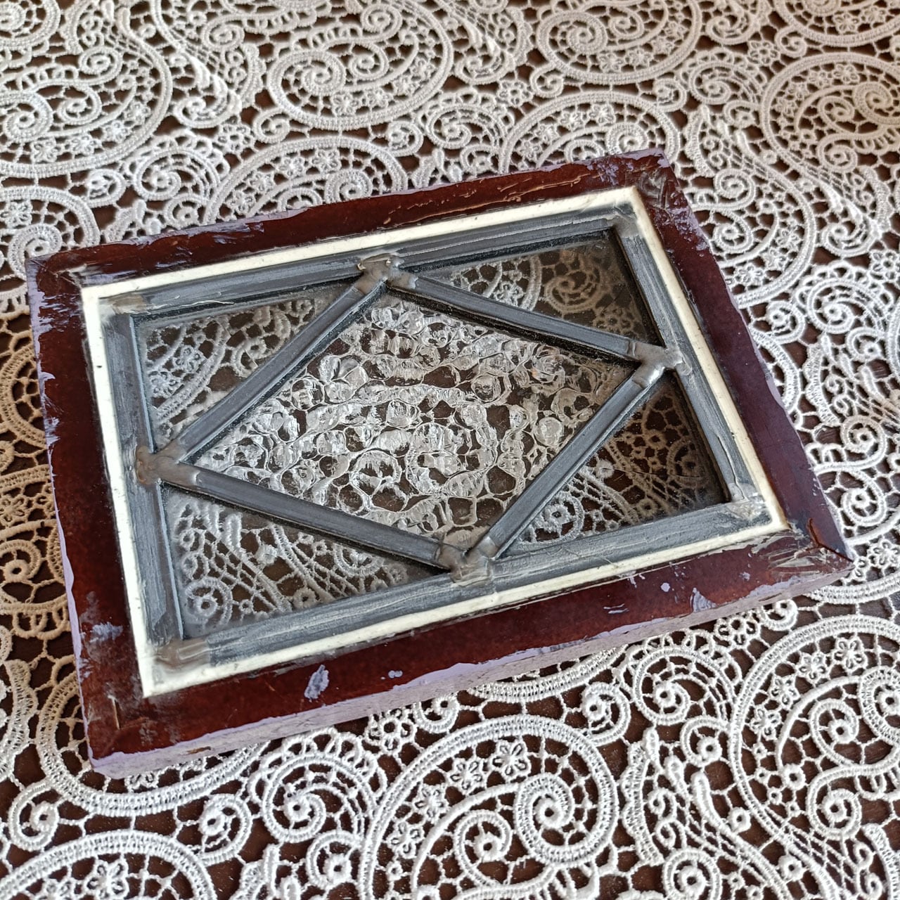 ガラスを鉛で組み、ハンダ付けしてパテを埋め数日乾かして馬ブラシで磨き上げるという手間のかかった方法です。