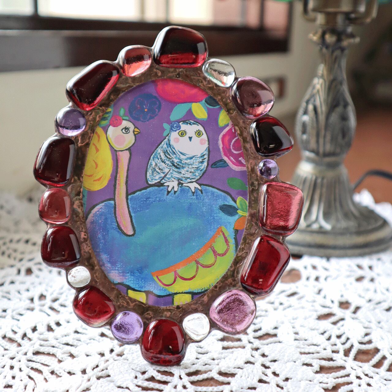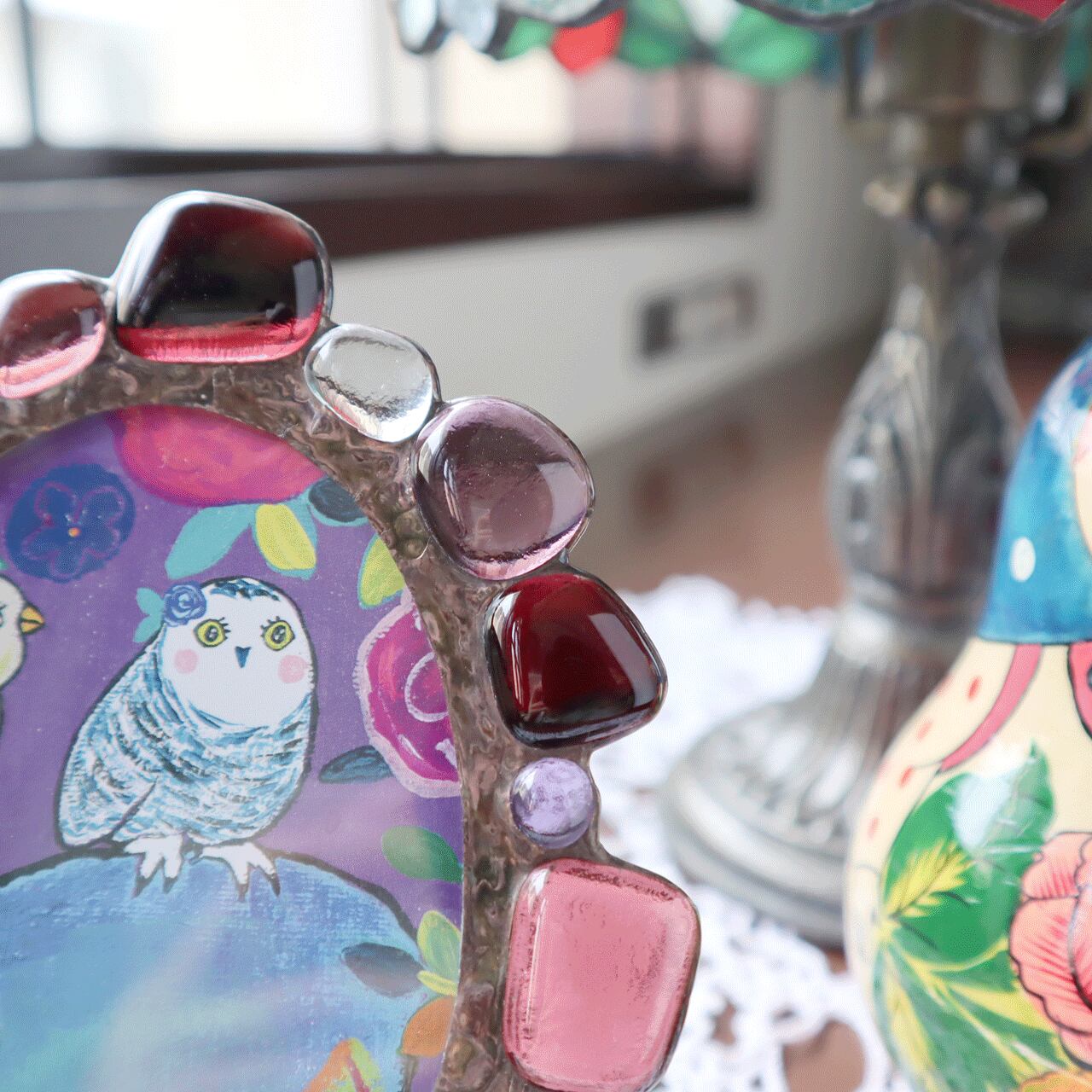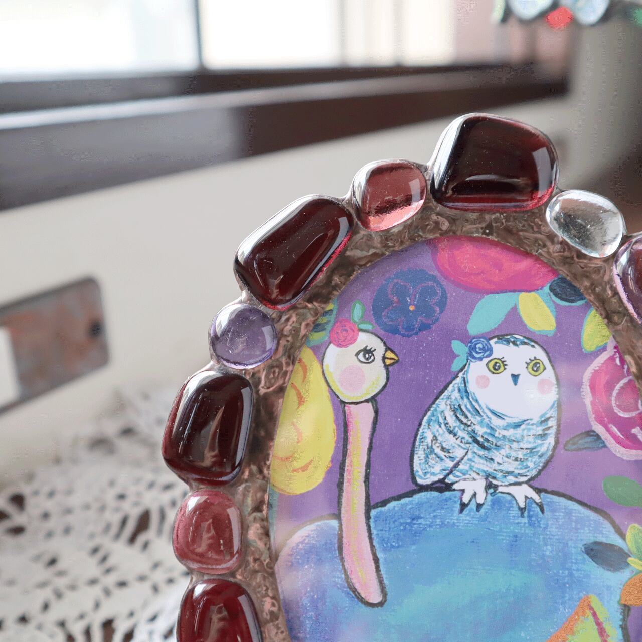 ガラスを溶かしたジュエルで作ったステンドグラスのフォトフレームです。