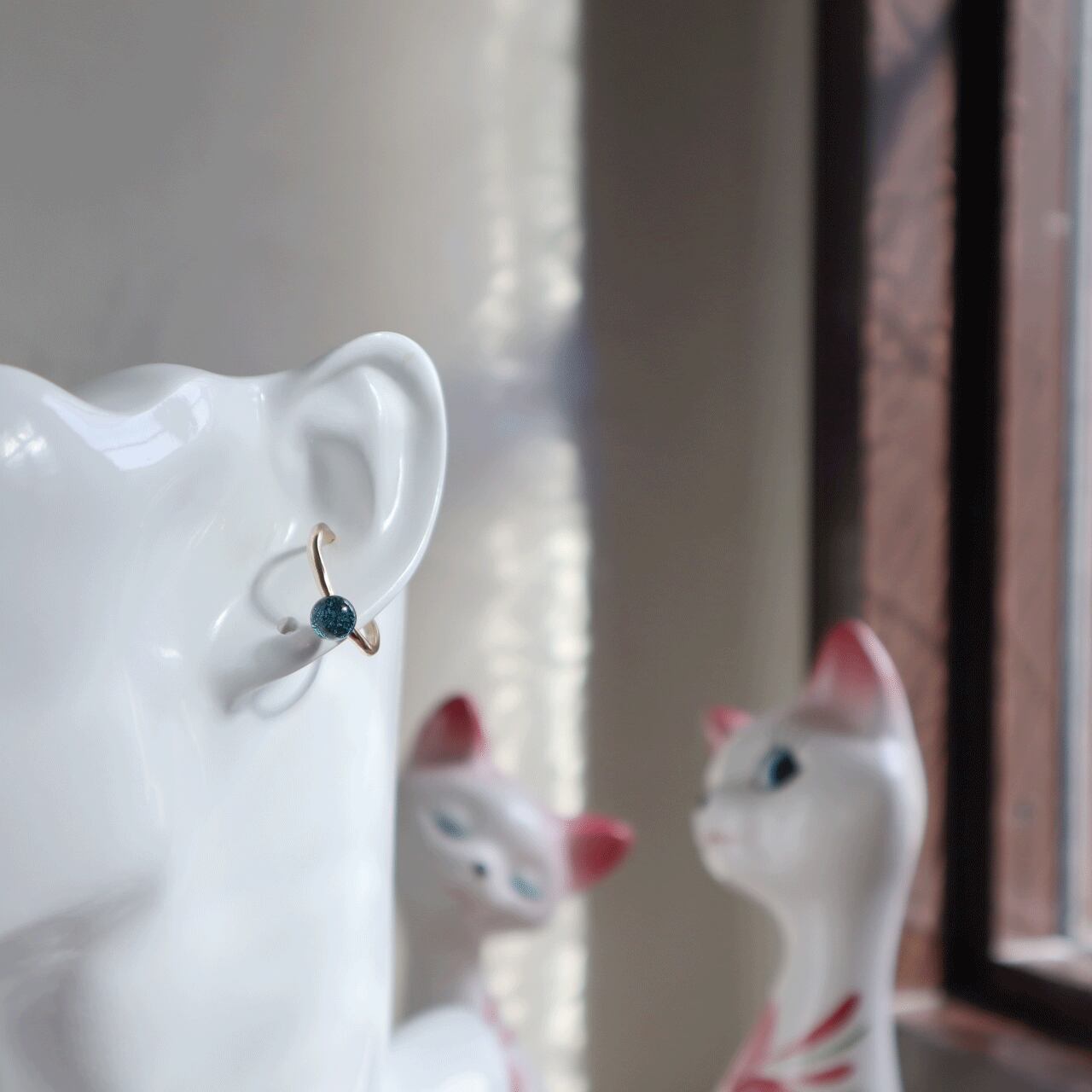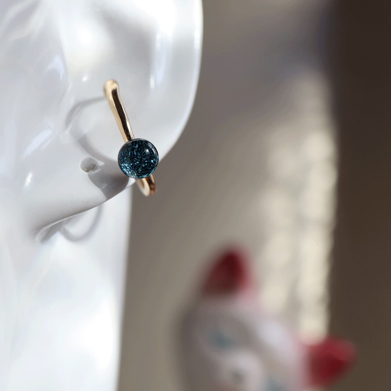 耳につける際、リングを軽く両側から閉めて頂くと安定します。